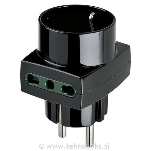 SICURY 250 V~ večsmerni adapter, črn - maksimalna obremenitev 1500 W - 2P+E 16 A vtič, nemški/francoski standardi - dve vtičnici 2P+E 16 A Bpresa, italijanski standard P17/11 in ena vtičnica 2P+E 16 A , italijanski standard P30 (bočni in osrednji ozemljitveni kontakti)