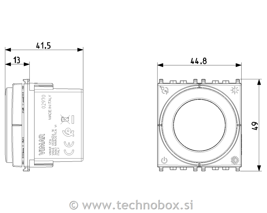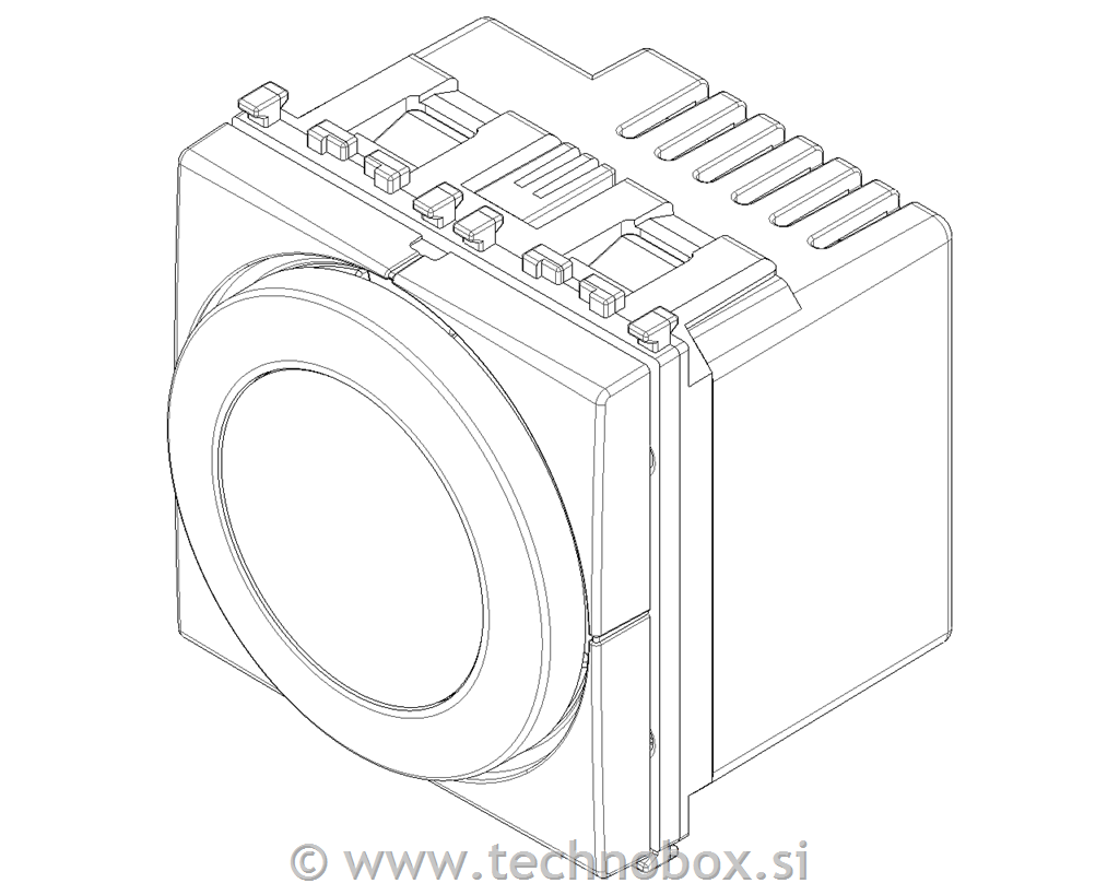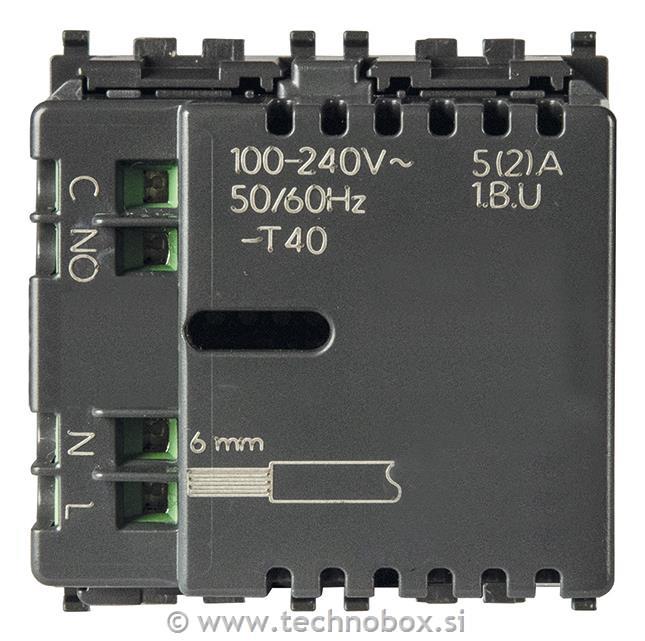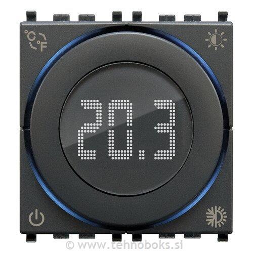 Termostat s številčnico z relejnim izhodom 5(2) A 240 V~, ogrevanje in klimatizacija v načinu ON/OFF, naprava za nadzor temperature razreda I (prispevek 1%), bela LED osvetlitev ozadja z regulacijo svetlosti, 100-240 V 50/60 Hz napajalnik, siva - 2 modula. Za dopolnitev s pokrivnimi ploščami Eikon, Arké in Plana, za Idea z namenskim montažnim okvirjem 16723
