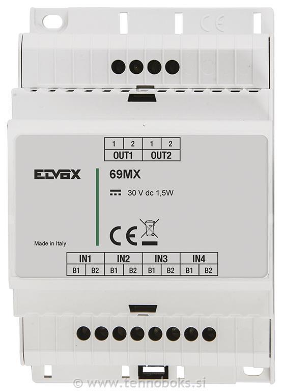 Koncentrator za vzporedno povezavo do 4 vhodnih panelov na modul, od tega vsaj en video vhodni panel, montaža na DIN letev (60715 TH35), zavzema 4 module velikosti 17,5 mm.