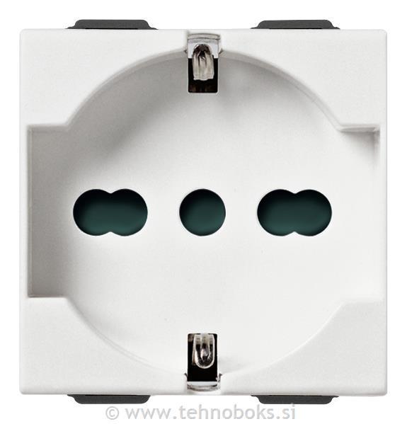2P+E 16 A 250 V~ šuko vtičnica, univerzalna, za 2P 2,5 A evrovtiči, 2P in 2P+E 10 A in 16 A italijanski standardni vtiči, 2P+E 16 A nemški standardni vtiči, bela - 2 modula. Ozemljitev ni izvedena z 2P+E 16 A 250 V~ francoskim standardnim vtičem