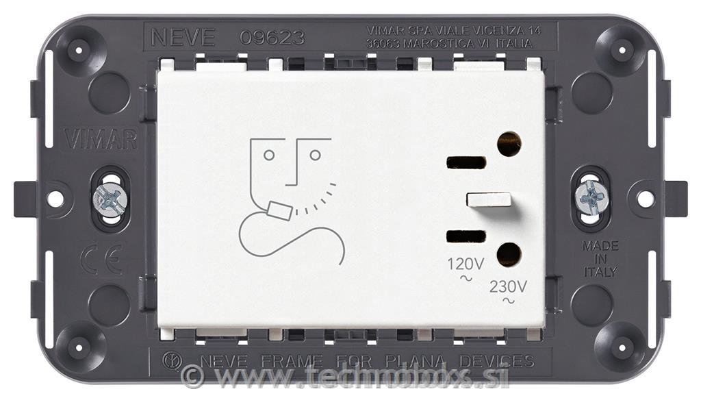 Vtičnica za brivnik z izolacijskim transformatorjem 20 VA, napajanjem 230 V~ 50-60 Hz, 120 V~ izhodom za 2P 15 A 125 V~ ameriškim standardnim nepolariziranim ploskim vtičem in 230 V~ izhodom za 2P 2,5 A eurovtiči, bela - 3 moduli
