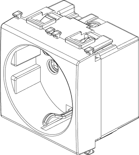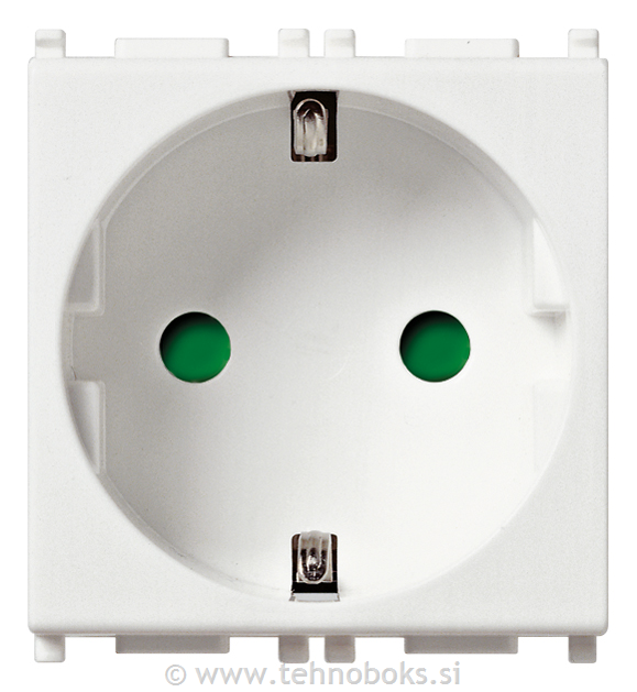 Vtičnica šuko, velikosti 2M, bele barve iz programa Vimar Plana ima vijačno pritrditev vodnikov 1.5-2.5mm2.