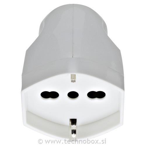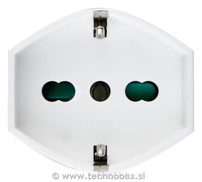Prenosna 2P+E 16 A 250 V~ SICURY vtičnica, univerzalna, za 2P 2,5 A evrovtiči, za 2P in 2P+E 10 A in 16 A italijanski standardni vtiči, 2P+E 16 A nemški standardni vtiči, aksialni kabelski vhod , bela. Ozemljitev ni izvedena z 2P+E 16 A 250 V~ francoskim standardnim vtičem