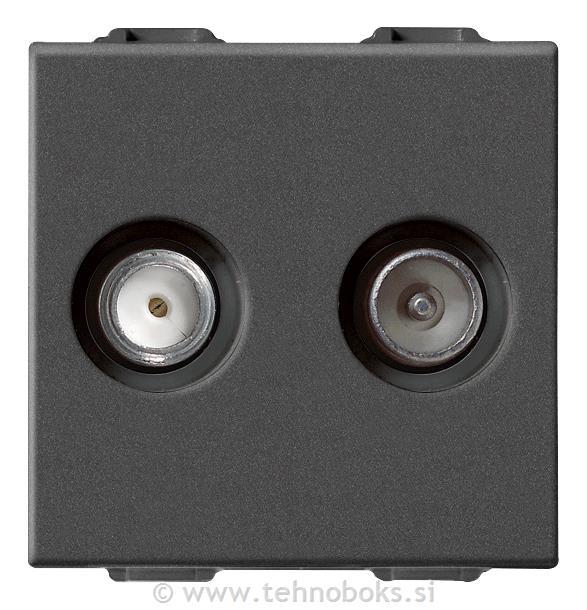 TV-RD-SAT koaksialna vtičnica, 5-2400 Mhz, ena povezava, demixed, 2 izhoda z moškim konektorjem (TV-RD) in ženskim konektorjem tipa F (SAT), 1 dB slabljenje priključka, karbonski mata - 2 modula. Omogoča prehod enosmernega toka in krmilnih signalov (24 V 500 mA max)