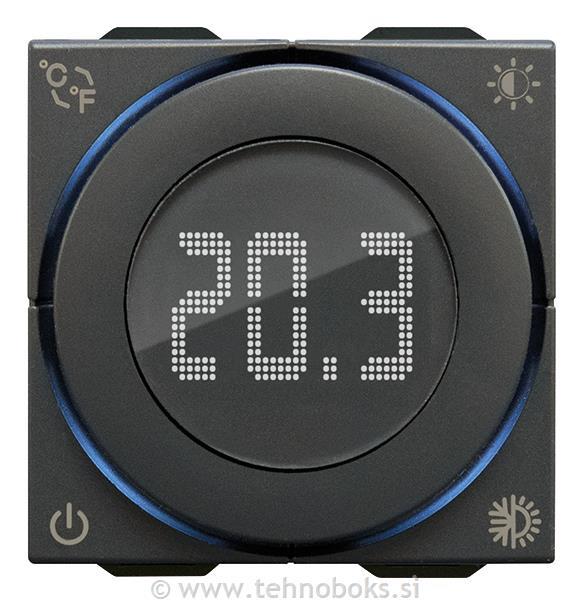 Termostat s številčnico z relejnim izhodom 5(2) A 240 V~, ogrevanje in klimatizacija v načinu ON/OFF, naprava za nadzor temperature razreda I (prispevek 1%), bela LED osvetlitev ozadja z regulacijo svetlosti, 100-240 V 50/60 Hz napajalnik, karbonski mat - 2 modula