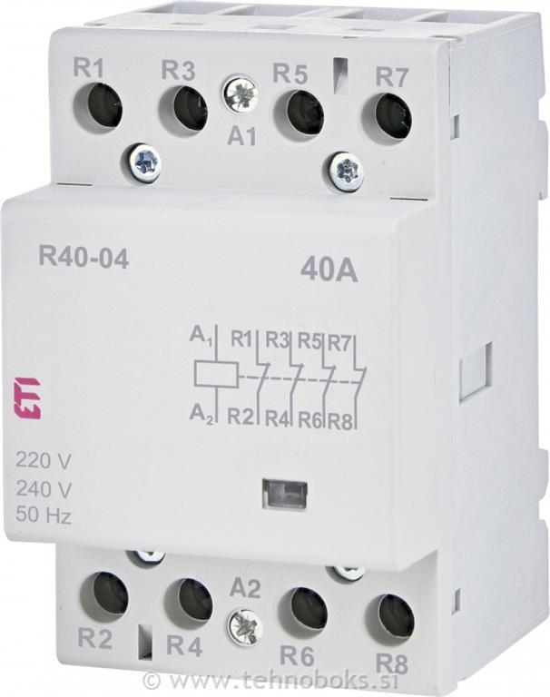 Inštalacijski kontaktor ETICON ima nazivni delovni tok 40A, 4 normalno zaprte kontakte, nazivna krmilna napetost 230V AC ter zaseda 3 modularna mesta.