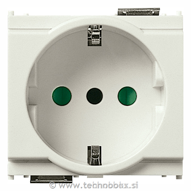 Vtičnica ima že vgrajeno otroško zaščito pred dotikom kontaktov. Vgrajuje se v modularne doze.
