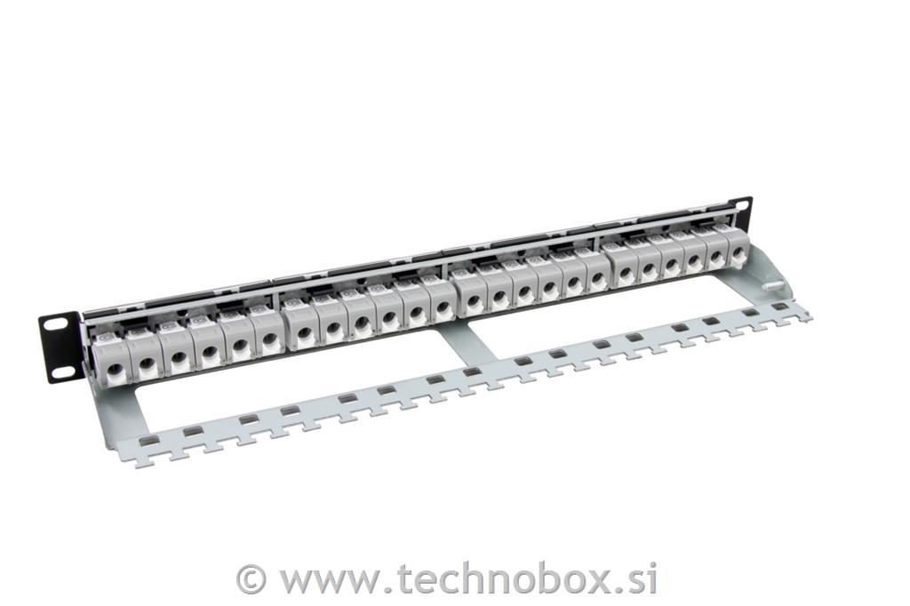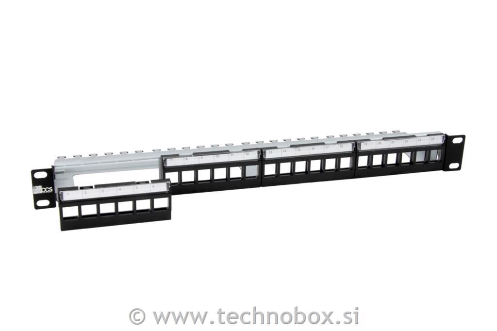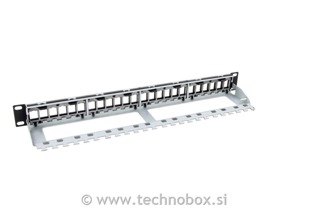 Struktura: Okvir iz pločevine, 4 odstranljivi plastični moduli s 6 praznimi standardnimi položaji keystone, ki omogočajo sprednjo namestitev vtičnic RJ45, prozorno držalo za etikete, kovinska zadnja podpora za upravljanje kablov