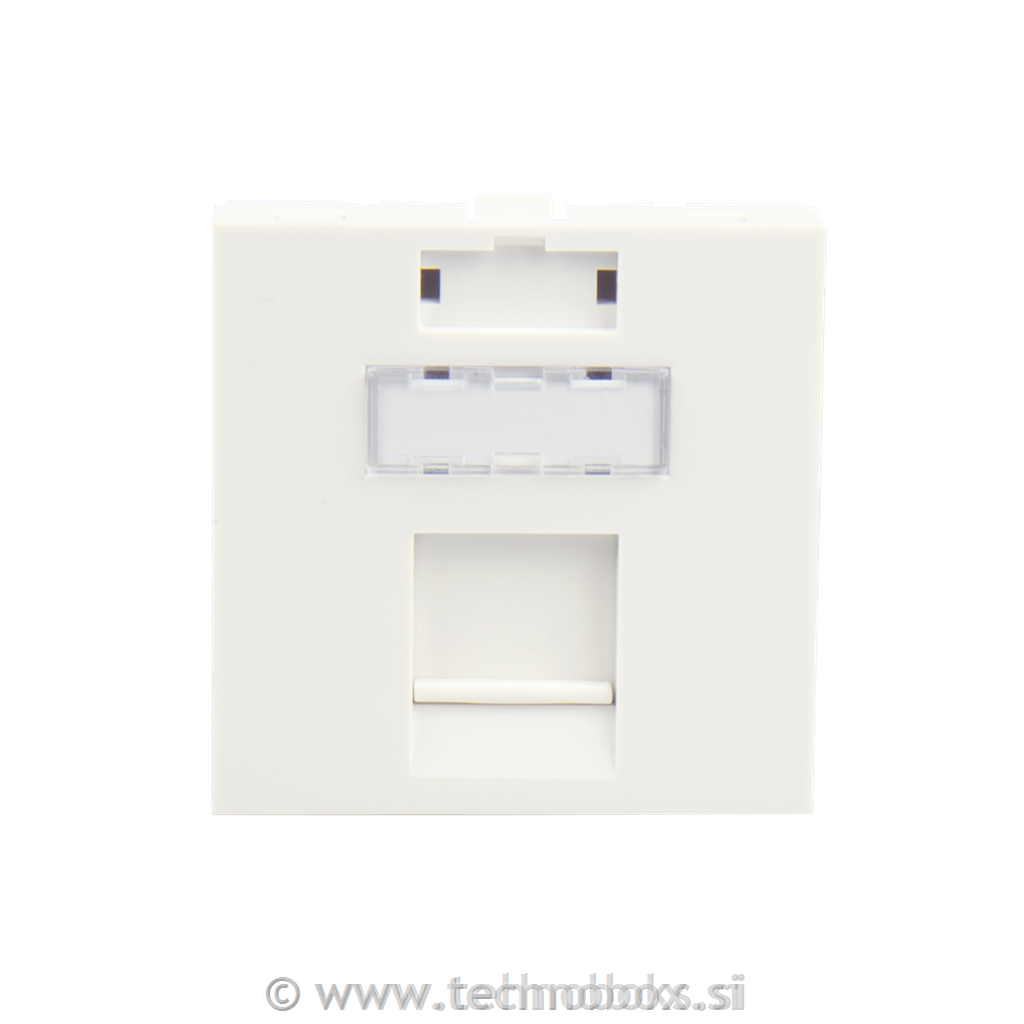 1-pozicijski modul Keystone tipa z giljotinskim zapiralom za kategorije 5E, 6 in 6A RJ45 CCS vtičnice za namestitev na francoske standardne samonosne okvirje z luknjo 45 × 45 mm.