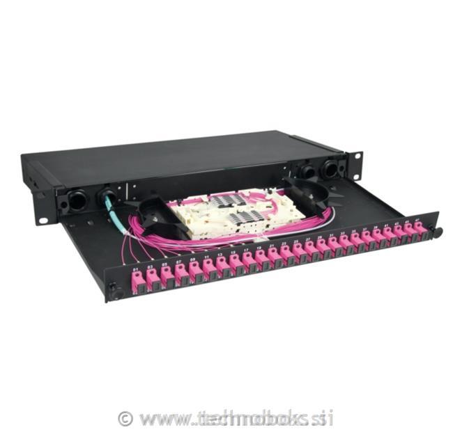 Izvlečni optični panel s 24 praznimi položaji za kompase SC Simplex, LC Duplex, MTRJ, primeren za zaključevanje optičnih kablov v 19-palčnih omarah. Drsni panelj, s sprednjim vijačnim pritrdilnim sistemom, ki omogoča enostavno odpiranje in zapiranje, je opremljen s polkrožnimi podporami in lepilnimi sponkami za upravljanje zalog; v zadnjem delu so 4 vhodi z režami za varno pritrditev kablov, ki jih je treba zaključiti. Montažni nosilci, nastavljivi po globini, omogočajo vgradnjo panela tudi v omare z zmanjšano globino. V kompletu z zapiralnimi pokrovčki, kabelskimi uvodnicami in kabelskimi vezicami za upravljanje in pritrditev optičnih vlaken.