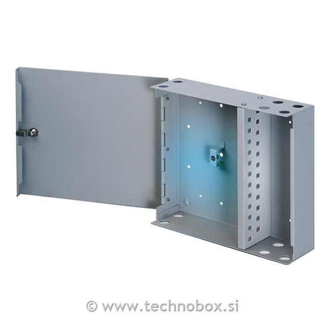 Stenska optična škatla s 24 praznimi prostori za SC simpleks ali LC duplex vtičnice, ki se lahko uporablja za spoje med kabli ali za povezovanje preko pigtailov. Stičišče, opremljeno s posebnimi predispozicijami, omogoča vhod optičnih kablov od zgoraj in spodaj ter zadrževanje pladnjev za držalo spojk; območje obliž ščiti povezave in omogoča vzdrževanje ožičenja.