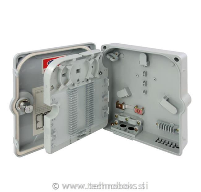 ABS ohišje, 180° odpiranje vrat s ključem, 2 vhoda s kabelsko uvodnico in 24 vhodov za spuščene kable, integriran spojni pladenj, 24-pozicijska podpora za vtičnice SC Simplex ali LC Duplex