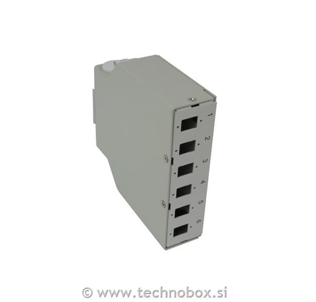 Optična omarica s 6 praznimi položaji za SC Simplex ali LC duplex puše za industrijske aplikacije, ki lahko upravljajo do največ 12 optičnih vlaken, primerna za namestitev na DIN letev.