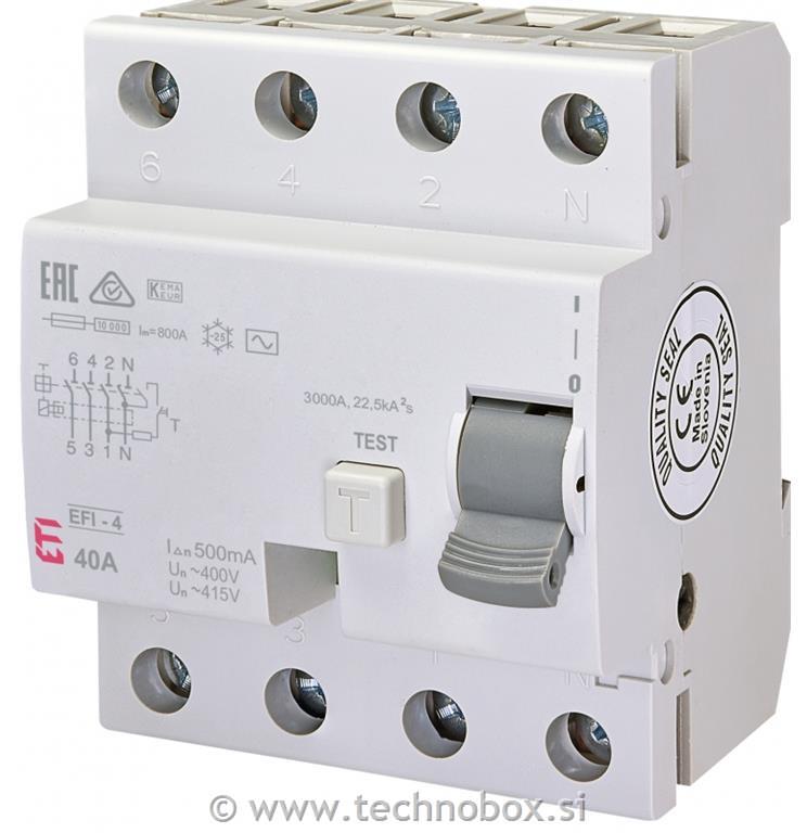 Zaščitno stikalo na diferenčni tok (FID) ASTI EFI P4 - 4 polno, nazivnega toka 40A, tipa AC in nazivnega diferenčnega toka 500mA.