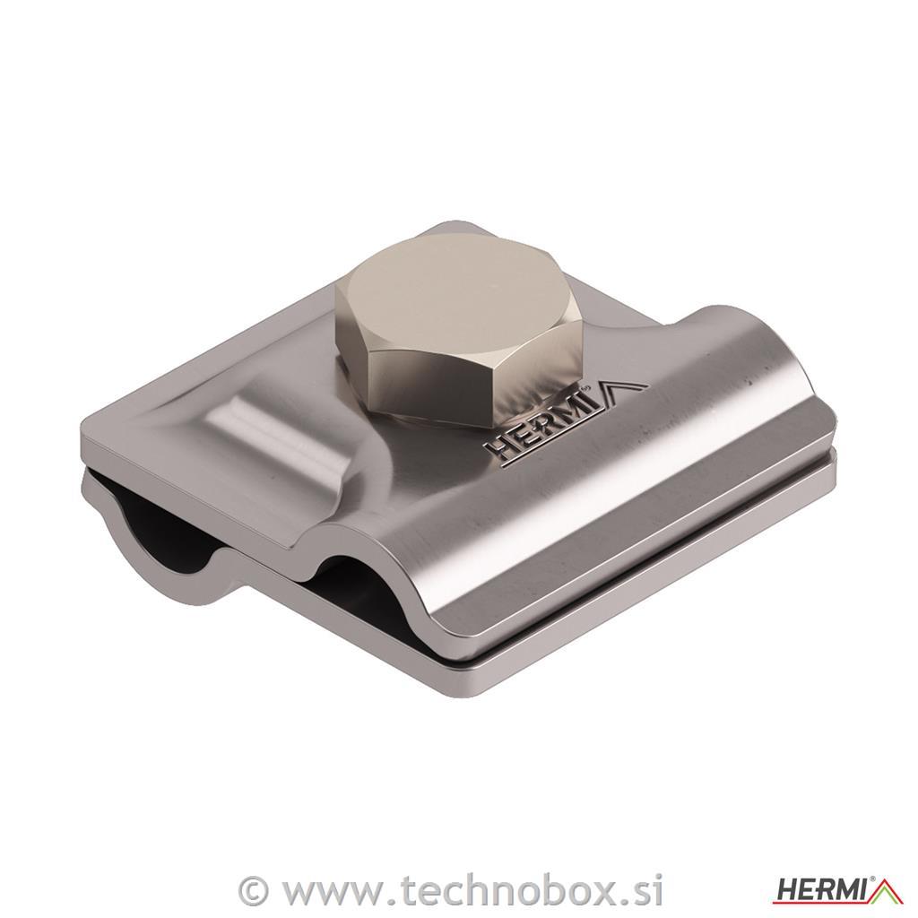 KON04 A SIMPLE sponka, sestavljena iz 2 ploščic dimenzij 40 mm x 40 mm in vijaka M10, namenjena izvedbi spojev med okroglimi vodniki fi8 – fi10 mm in pločevinastimi deli nad zemljo.