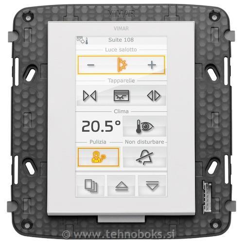 4,3-palčni Full Flat zaslon na dotik za avtomatsko krmiljenje in nadzor, standard KNX, 1 vhod temperaturnega senzorja, z vgrajenim 8-modulnim montažnim okvirjem za dopolnitev s pokrivnimi ploščami Eikon Evo, Eikon, Arké ali Plana, bela