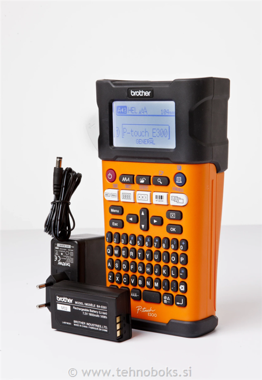 - priloženo: AC-napajalnik model AD-E001, akumulatorska baterija BA-E001, močno lepljivi trak črno na rumenem 18 mm (8 m), kovček, trak za nošenje