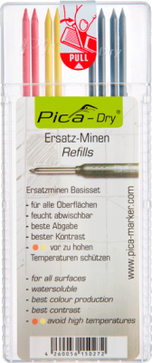 Vodotopne minice Pica Dry Multi-Use 4020 za označevalni svinčnik v treh barvah. Primerne za vse površine, tako suhe kot mokre, gladke ali hrapave, prašne ali mastne, svetle ali temne. Z gladkih površin se enostavno izbrišejo z mokro krpo. Primerne za večino materialov kot so les, mavčne plošče, plastika, keramika, kovina. Minice so ošiljene.