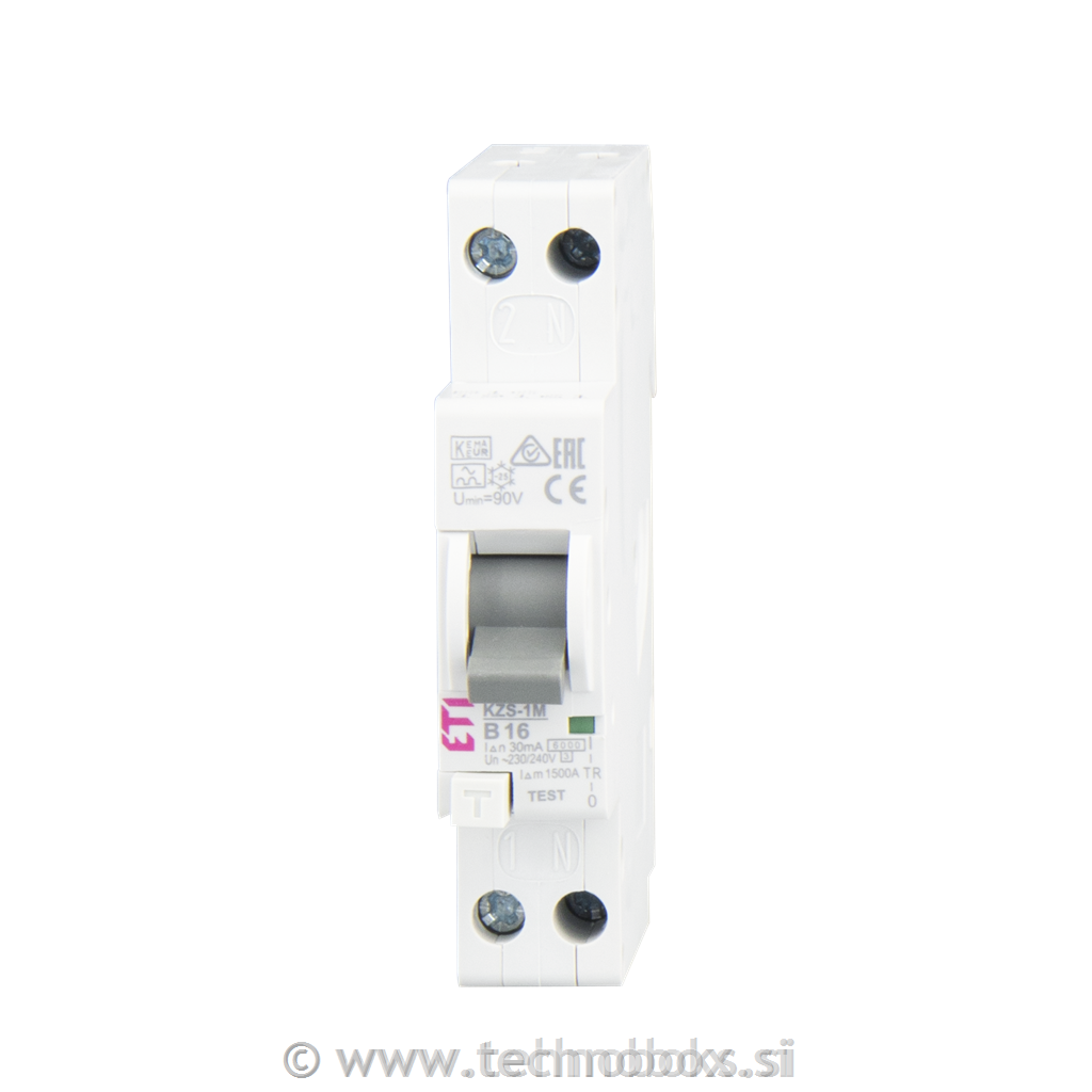 Kombinirano zaščitno stikalo na diferenčni tok z nadtokovno zaščito (KZS) ASTI - 2 polno, nazivnega toka 16A, tipa A, izklopne karakteristike B in nazivnega diferenčnega toka 30mA.