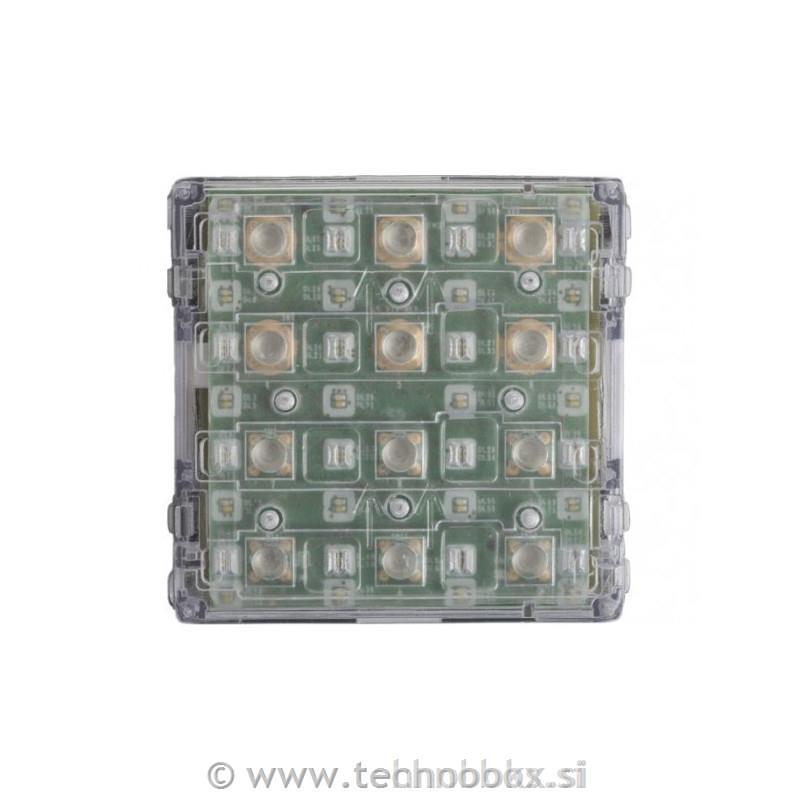 Modul s tipkovnico za digitalni klic. Elektronski modul z ohišjem iz tehničnega polimera, opremljen z alfanumerično tipkovnico z 12 gumbi z dvojno osvetlitvijo ozadja (modra ali bela). Prilagoditev barve in svetlosti led preko glavnih modulov. Tipke od 0 do 9 za vnos kode in 2 drugi tipki za glavne funkcije: aktivacija klica in potrditev dostopne kode. Dopolniti s sprednjo ploščo digitalnega klicnega modula. V kombinaciji z ustrezno sprednjo stranjo zagotavlja stopnjo zaščite pred vodo in prahom IP54.