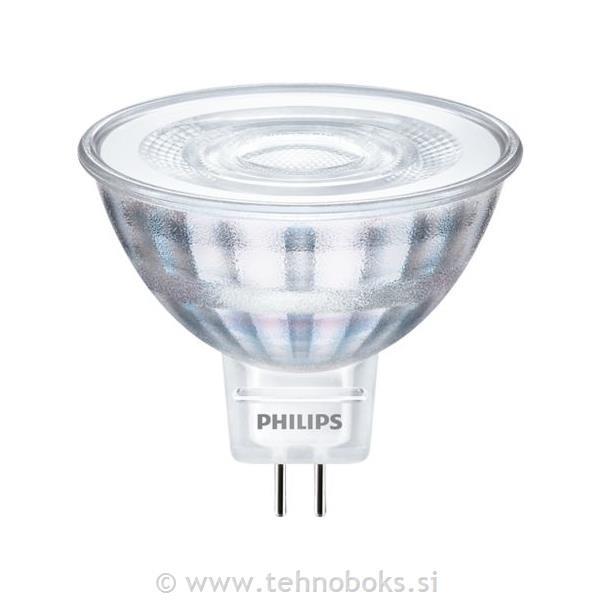 Led sijalka reflektorska premera fi 50mm, proizvajalca Philips ima moč 5-35W, svetlobni tok 345 lumnov, toplo belo svetlobo 2700K, kot osvetlitve 36 stopinj, okov/podnožje GU5,3, nima možnosti zatemnitve /dimanja.
