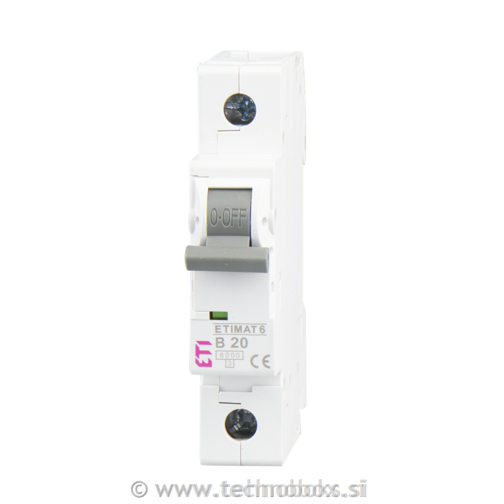 Inštalacijski odklopnik (avtomatska varovalka) ETIMAT 6 proizvajalca ETI, karateristike B z nazivnim tokom 20A in kratkostično zmogljivostjo 6 kA. Ima 1 pol z vgradno širino 18 mm.