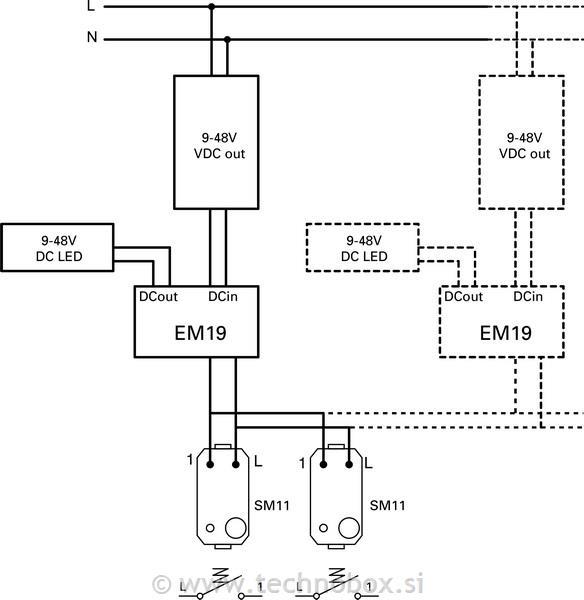 - vezava z vsemi LED napajalniki s konstantno napetostjo in nekaterimi LED