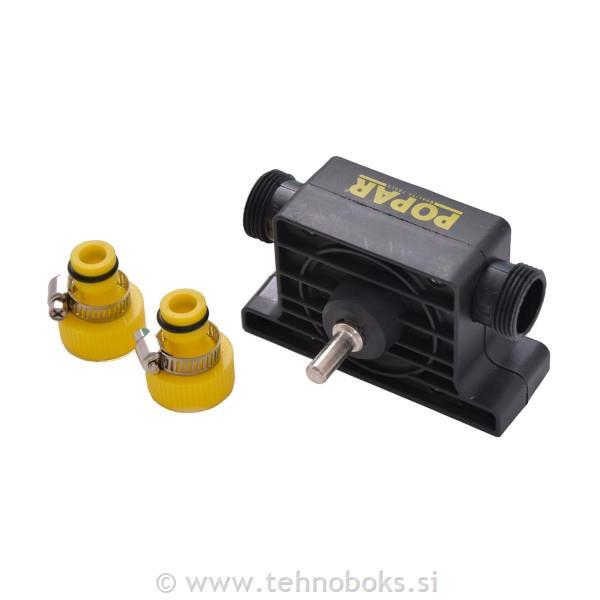 Ohišje iz najlona s plastičnimi dodatki. Pretvori vsak vrtalni stroj v visoko zmogljivo črpalko, ki lahko izprazni korita, akvarije, lovilce umazanije v bazenih in drugo. Samodejno sesanje do 3 m in zmogljivost črpanja vode iz globine do 13 m z max. pretokom vode 1.800 l/h.