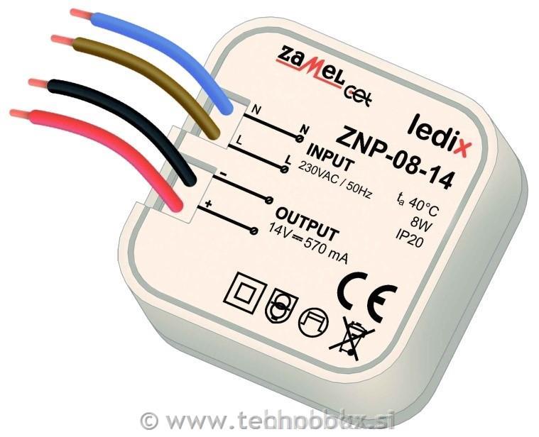Napajalnik ZNP-08-14 je profesionalni impulzni napajalnik z izhodno napetostjo 14 V DC in nazivno močjo 8 W. Napajalnik je zasnovan za delo z izdelki LEDIX (luči, krmilniki, radijski sprejemniki) z napajanjem 14 V DC. Nameščen je v namestitveni škatli. Naprava je zaščitena pred kratkim stikom in preobremenitvijo, kar povečuje varnost uporabe. Visoka zmogljivost in nizka poraba toka v stanju pripravljenosti zagotavljata zelo varčno delovanje. Naprava je namenjena neprekinjenemu delovanju. Napajanje ustreza harmoniziranim standardom.