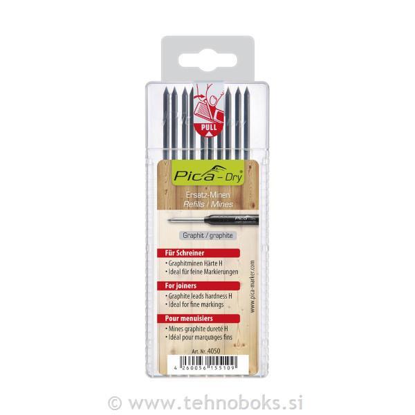Pica Dry 4050 grafitne svinčene minice za mizarje, specialne trdote H. Primerne za fino označevanje na večini suhih površin. Niso primerne za steklene in sijoče površine.