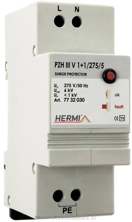 PZH III V 1+1/275/5 je enofazni odvodnik prenapetosti tipa 3 po EN 61643-11 primeren za TNS in TNC sisteme. Zasnovan je za univerzalno uporabo za zaščito vseh električnih naprav, priključenih na L.V. napajalni sistem proti impulznim prenapetostnim učinkom.