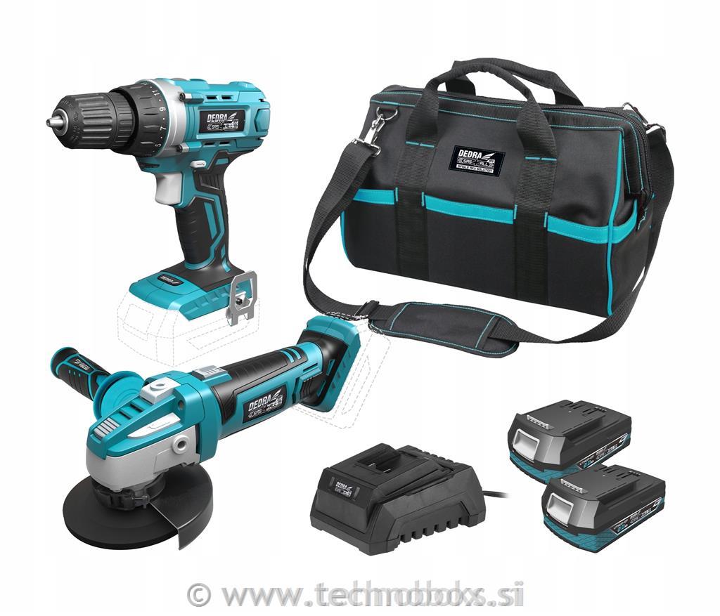 Set baterijskega orodja DED7013 Dedra je priporočljiv za DIY navdušence. Praktična torba za orodje vsebuje kotni brusilnik DED7050, vrtalni vijačnik DED7040, 2 bateriji 18 V 2,0 Ah in polnilec. Ta komplet se bo dobro obnesel pri različnih delih, ki se izvajajo v domači delavnici. Orodja so del brezžične linije SAS+ALL 18V, tako da jih lahko napaja ista litij-ionska baterija.