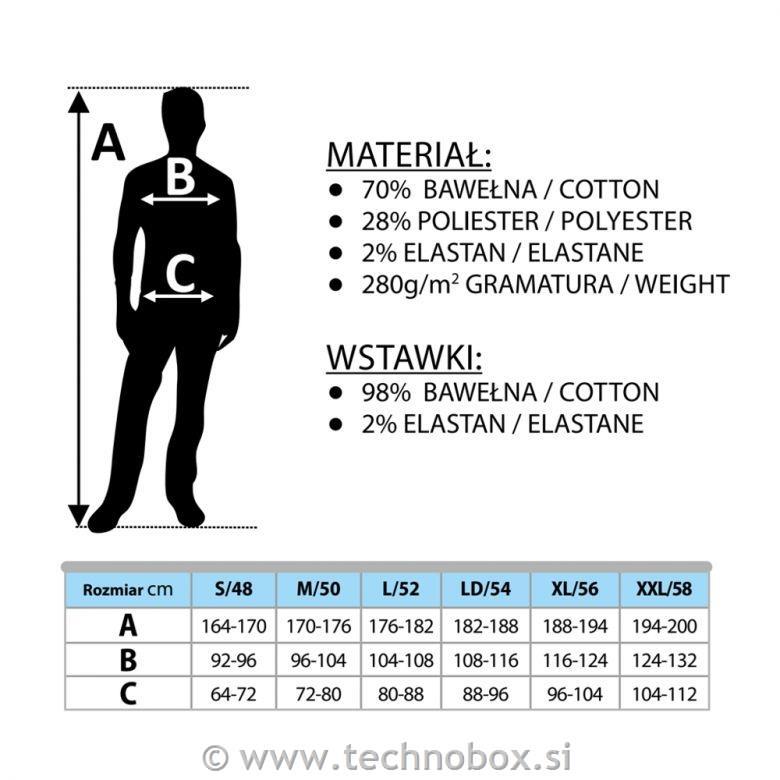 - Sestava materiala: 70% bombaž, 28% poliester + 2% elastan