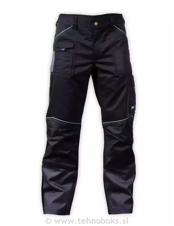 Zaščitne hlače PREMIUM LINE so izdelane iz mešanice poliestra in bombaža. Takšen material z težo 240 g/m2 zagotavlja visoko odpornost proti obrabi in mehanskim poškodbam. Dodatne ojačitve na kolenih iz Oxford materiala. Ima funkcionalne žepe, vključno z žepom za pametni telefon. Za povečanje trdnosti hlač so bili uporabljeni trojni šivi. Zahvaljujoč elastičnemu pasu so hlače enostavne za prileganje in udobne med uporabo. Všiti odsevni elementi za večjo varnost. Popoln za težja gradbena in obnovitvena dela.