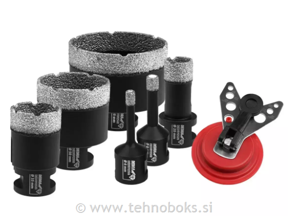 Komplet 6 vakuumsko spajkanih diamantnih svedrov, namenjenih izdelavi lukenj v keramičnih ploščicah, lončenini, betonu, opeki, steklu, asfaltu, laminatih, PVC-ju, jeklu, neželeznih kovinah, lesu itd. Uporaba navoja M14 omogoča montažo nastavka na vsak kotni brusilnik, prisesalno vodilo, ki je priloženo v kompletu, pa omogoča enostavno izdelavo natančne luknje.