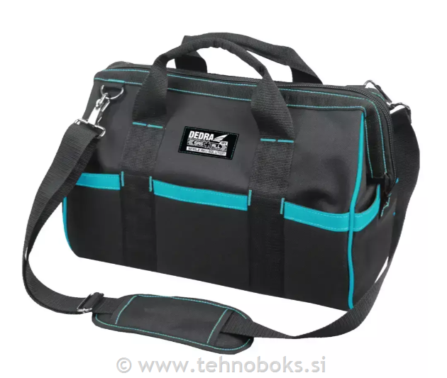 Torba je izdelana iz trpežnega, vodoodpornega, dvoslojnega 600D poliestra, ki zagotavlja odpornost izdelka na mehanske poškodbe, hkrati pa ščiti orodje med transportom. Torba se zapira z zadrgo in je opremljena z nastavljivo naramnico.