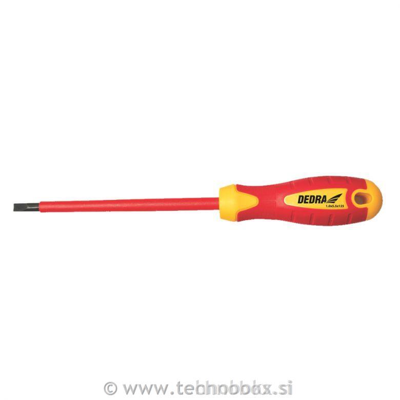 Ploščati izolirani izvijač 3 mm je orodje, ki se uporablja pri delih, povezanih z električnimi inštalacijami. Izvijač ščiti uporabnika pred električnim udarom do 1000V. Izolirana konica z magnetno konico, ki izboljša natančnost dela, je izdelana iz jekla S2. Ergonomski ročaj z nedrsečo površino zagotavlja varen oprijem in natančnost pri opravljanju dela. Izvijač izdelan v skladu z EN 60900 in VDE 1000V certificiran.
