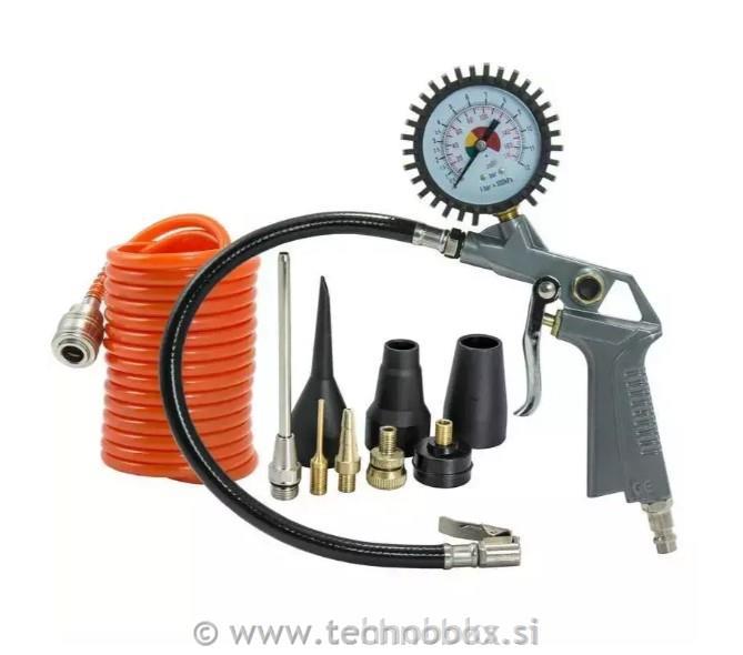Komplet pnevmatskih pripomočkov A532008 je namenjen za napihovanje koles, vzmetnic, žog, itd. Zasnovan za delovanje skupaj s kompresorji. To je komplet, ki bo dobro deloval med DIY, popravili ali med počitniškimi potovanji. Uporabno v vsakem gospodinjstvu.