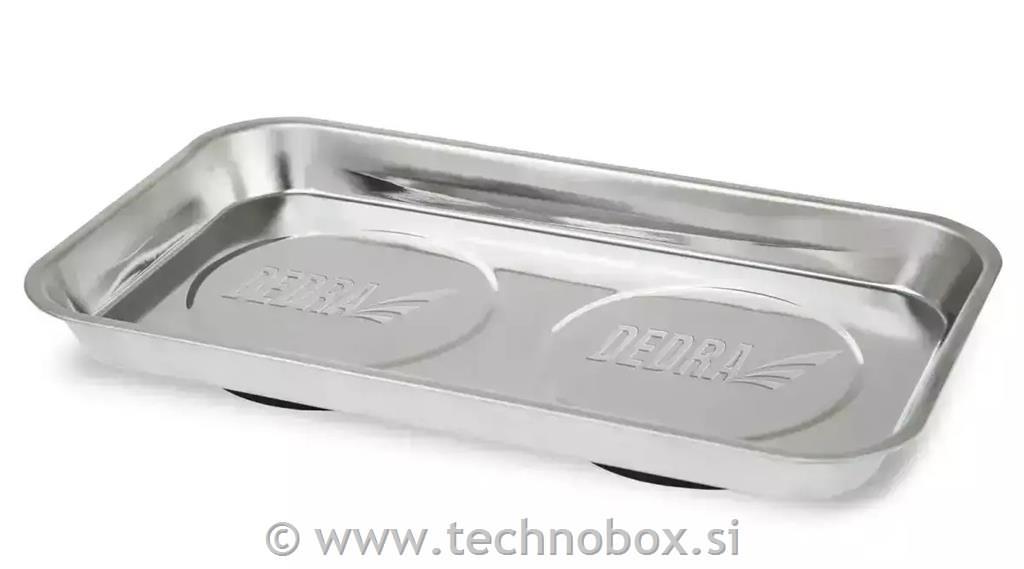Magnetna posoda pravokotne oblike je idealna rešitev za ljudi, ki želijo vzdrževati red na delovnem mestu. Velike dimenzije 140x240 mm in dva 80 mm močna magneta, vgrajena v podnožje, preprečujejo nenamerno izgubo vijakov, vijakov ali nastavkov. Posoda je izdelana iz nerjavečega jekla, katerega dno je dodatno obloženo z gumo, ki zagotavlja stabilnost tudi na neravnih površinah.