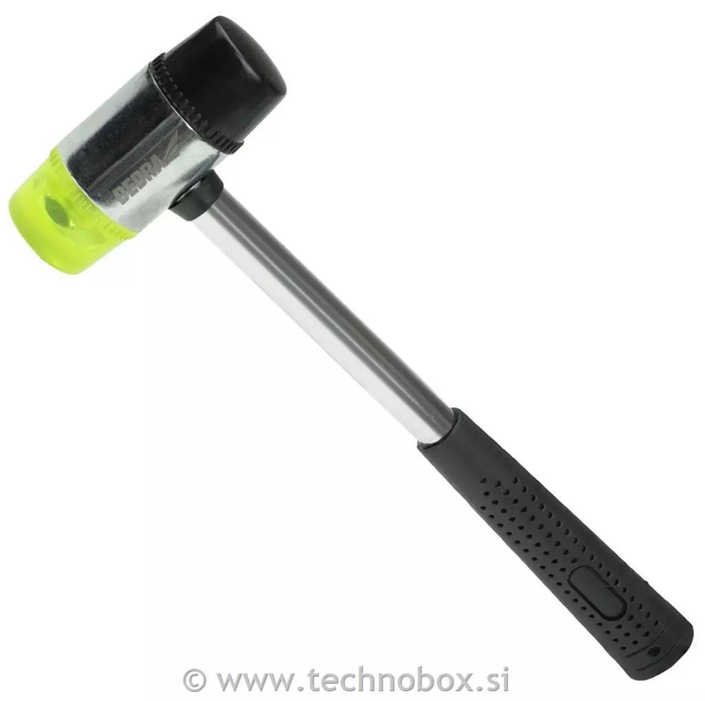 Kladivo za pločevino DEDRA 13M290 je orodje, ki je uporabno ne samo v ličarstvu, ampak tudi pri vseh delih, povezanih s tanjšo pločevino, kjer želimo doseči gladko površino. Dvodelna glava je izdelana iz plastike in gume, kar omogoča natančno in enakomerno oblikovanje pločevine brez nevarnosti poškodbe površine. Kladivo bo uporabno tudi pri splošnih montažnih dejavnostih, npr. za občutljiv in mehak les ali pri zabijanju pohištvenih plošč na zatiče, kjer bi uporaba ključavničarskega kladiva pustila grde površinske vdolbine. Kladivo za pločevino ima jekleno gred z gumijastim ročajem, ki zagotavlja visoko vzdržljivost in absorpcijo prekomernih tresljajev med delom. Gumiran ročaj se dobro prilega roki in preprečuje, da bi kladivo zdrsnilo iz roke.