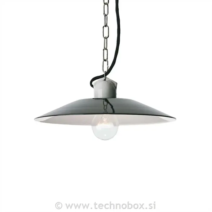 Luč visi na črnem, pletenem kablu in verižici; dolžine 150 cm, s porcelanastim grlom.