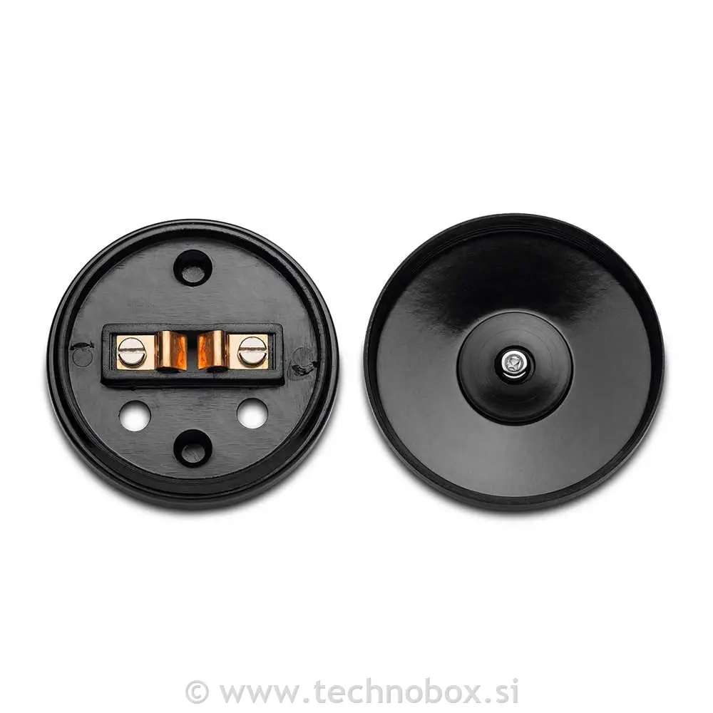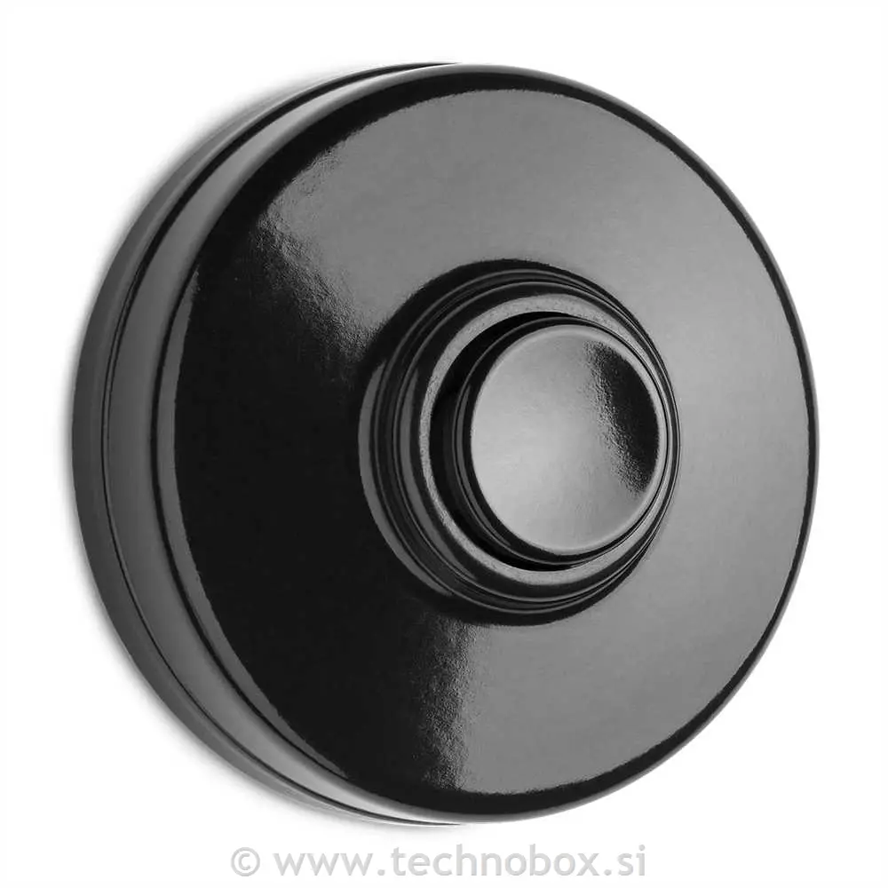 Okrogla tipka za zvonec iz črnega bakelita s črnim potisnim gumbom (nizkonapetostni zvonec) s samočistilnim kontaktom.