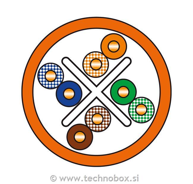 Neoklopljeni 4-parni kabel U / UTP kategorije 6 (100 Ohm) s križnim ločilnikom, LSZH (Low Smoke Zero Halogen) ognjevarni plašč, testiran do 500 MHz. Primeren za ustvarjanje prenosnih kanalov razreda E.