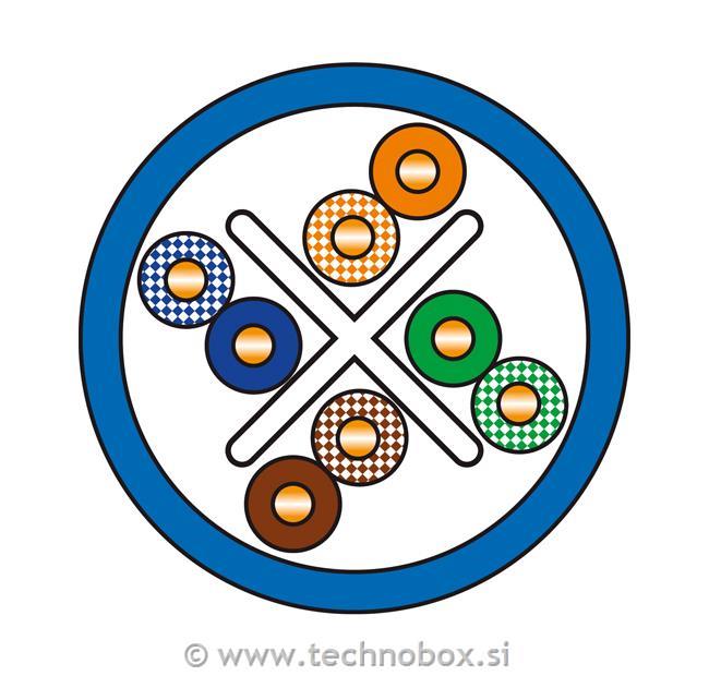 Neoklopljeni 4-parni kabel U / UTP kategorije 6 (100 Ohm) s križnim ločilnikom, LSZH (Low Smoke Zero Halogen) ognjevarni plašč, testiran do 250 MHz. Primeren za ustvarjanje prenosnih kanalov razreda E.